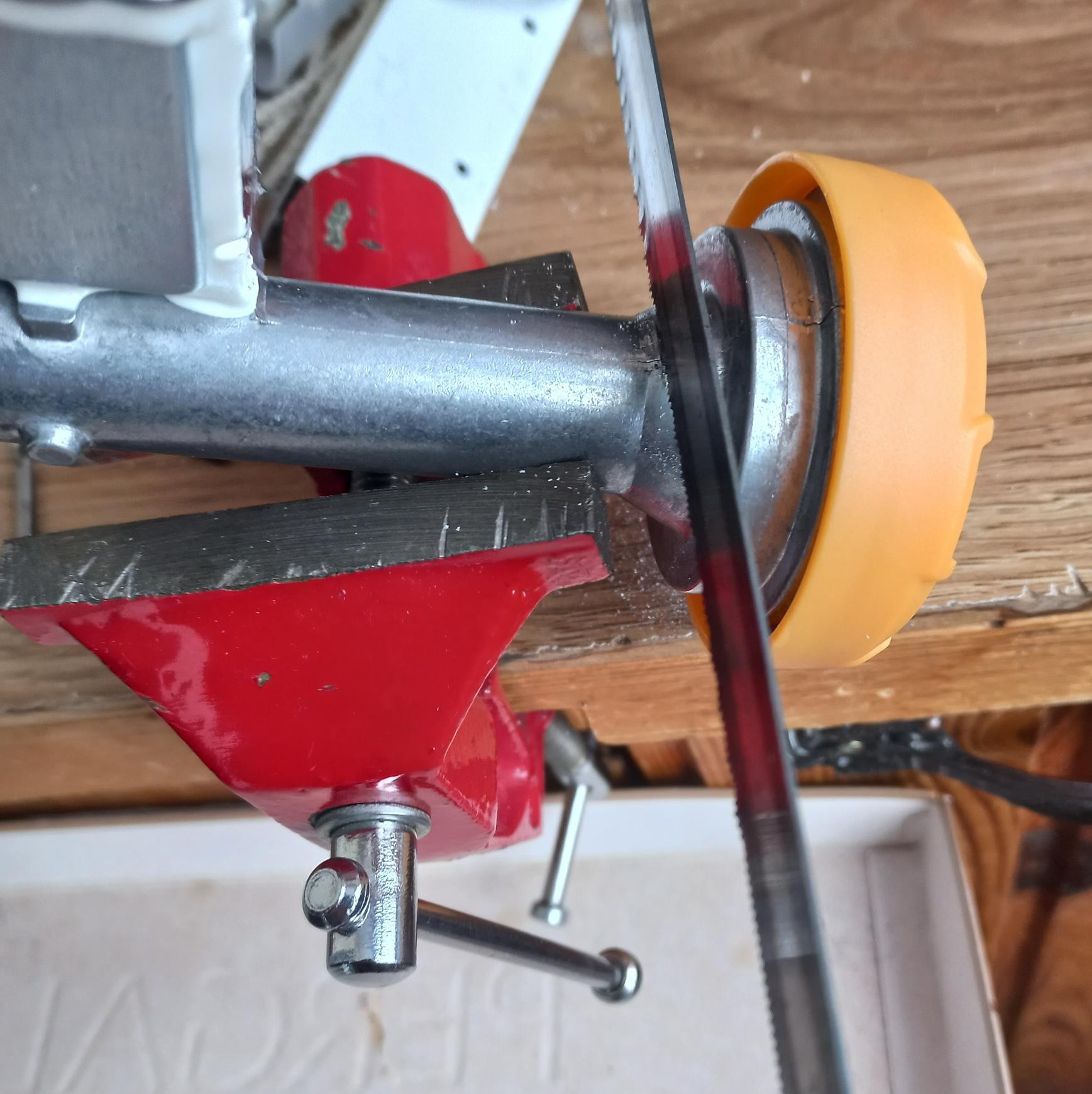 4.1 Режем раструб головки. Отщелкиваем пластиковые половинки, зажимаем в тиски раструбом вниз, чтобы опилки не попали внутрь.