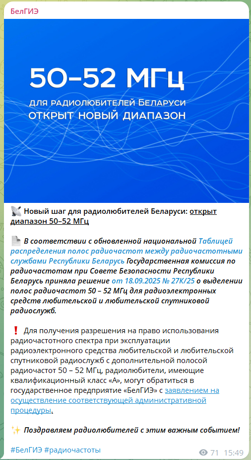 Хотелось бы верить, что в нём будет предложение по 50 МГц для любительской службы, интересно ведётся ли какая работа по предложению Минсвязи по этому вопросу???