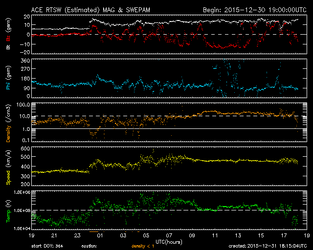Нам достаточно и Кр 6-7, дело не только в нём. Для того, чтобы с наших широт аврору за 10 с экспозиции на фотик заснять, нужно Кр от 7 и выше, Bz компонента должна уйти в минус 10-20 нТл, плотность плазмы подрасти до 100 и выше протонов на см^3. Для прохождения в радио -- свои критерии, но должны быть близко. В любом случае, CME вылетел 28 декабря, и скоро должен прилететь. А уж замкнёт ли его поле магнитные линии Земли или нет, когда это будет -- точно не известно.