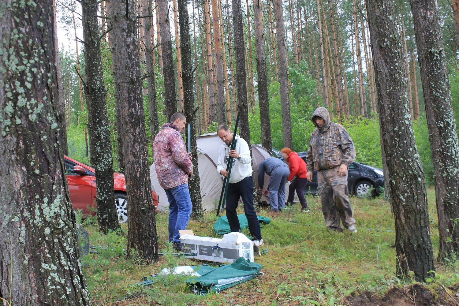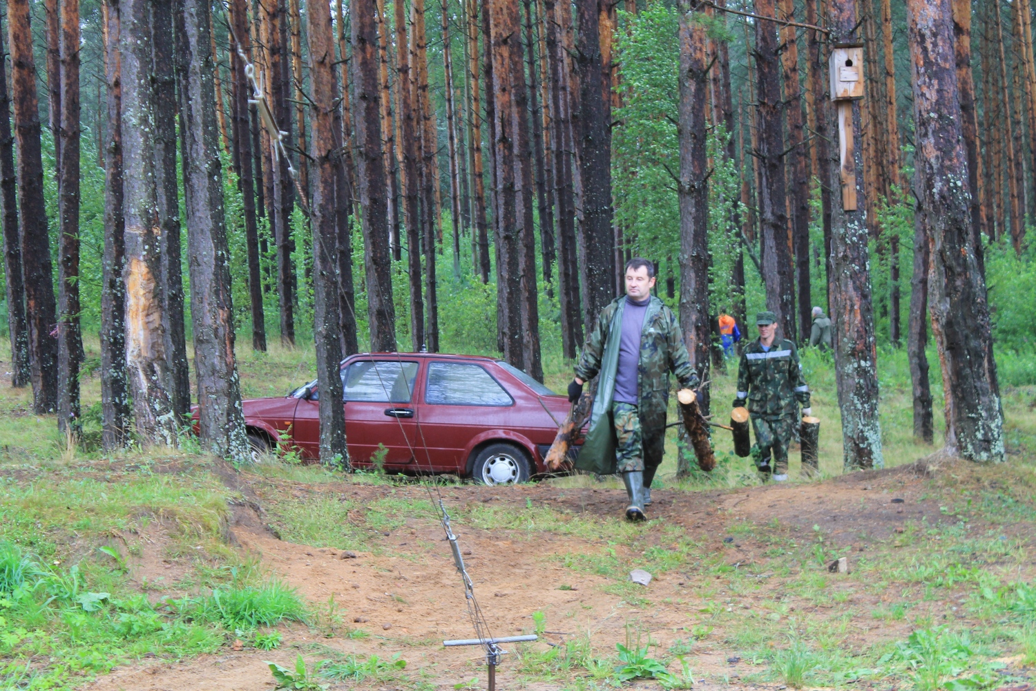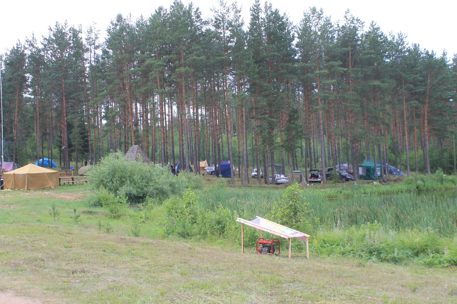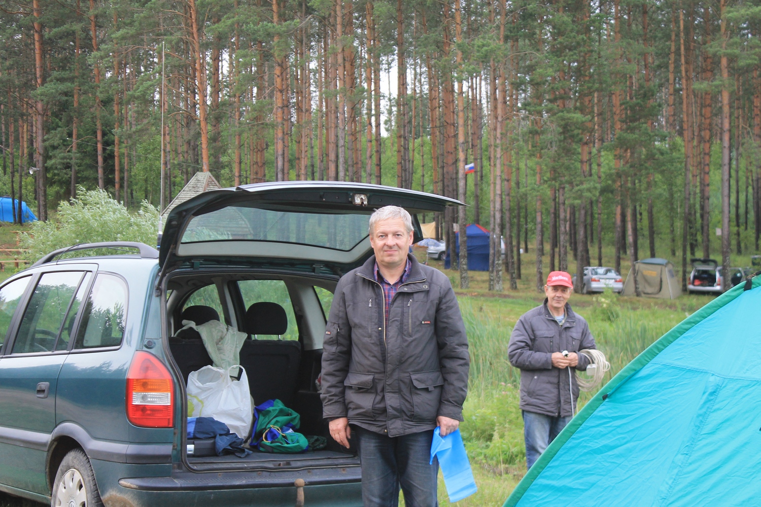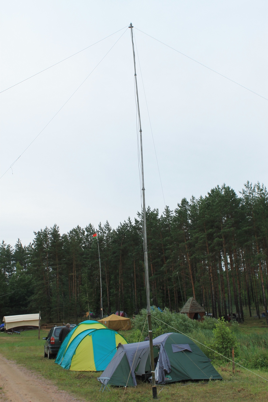 Проcмотрев прогноз погоды,решил не рисковать и заранее (в четверг 13 июля) развернуть на центральной площадке палатки и КВ-позицию.Именно в этот день на место расположения слёта отправился десант- EU7AL,EU7LA,Алеся и Сергей (дочь и зять EU7AL), и наш гость из Твери RA3IX.Погода была отличной.Вашему вниманию-фото от 13 июля: