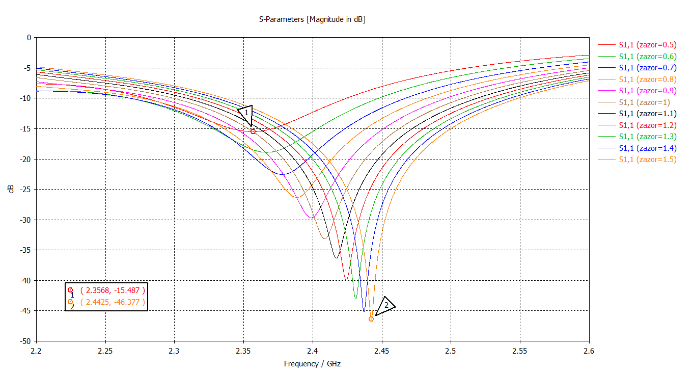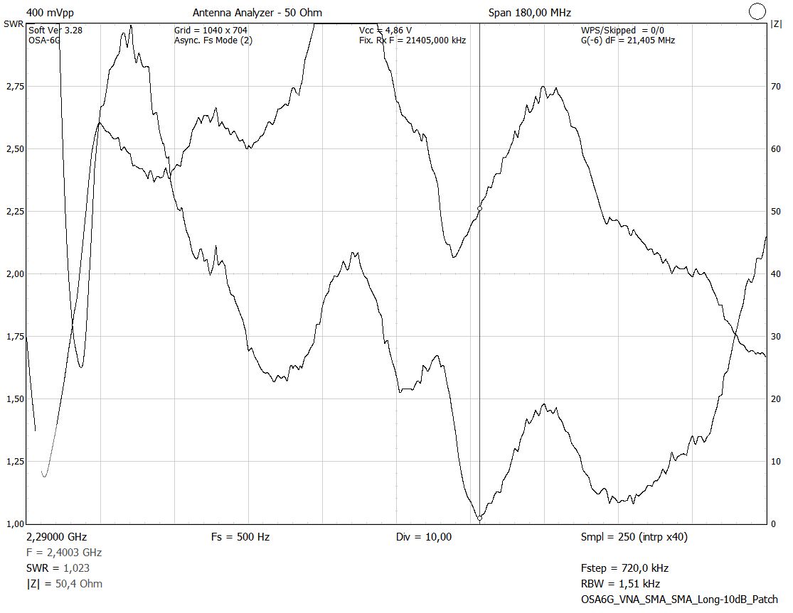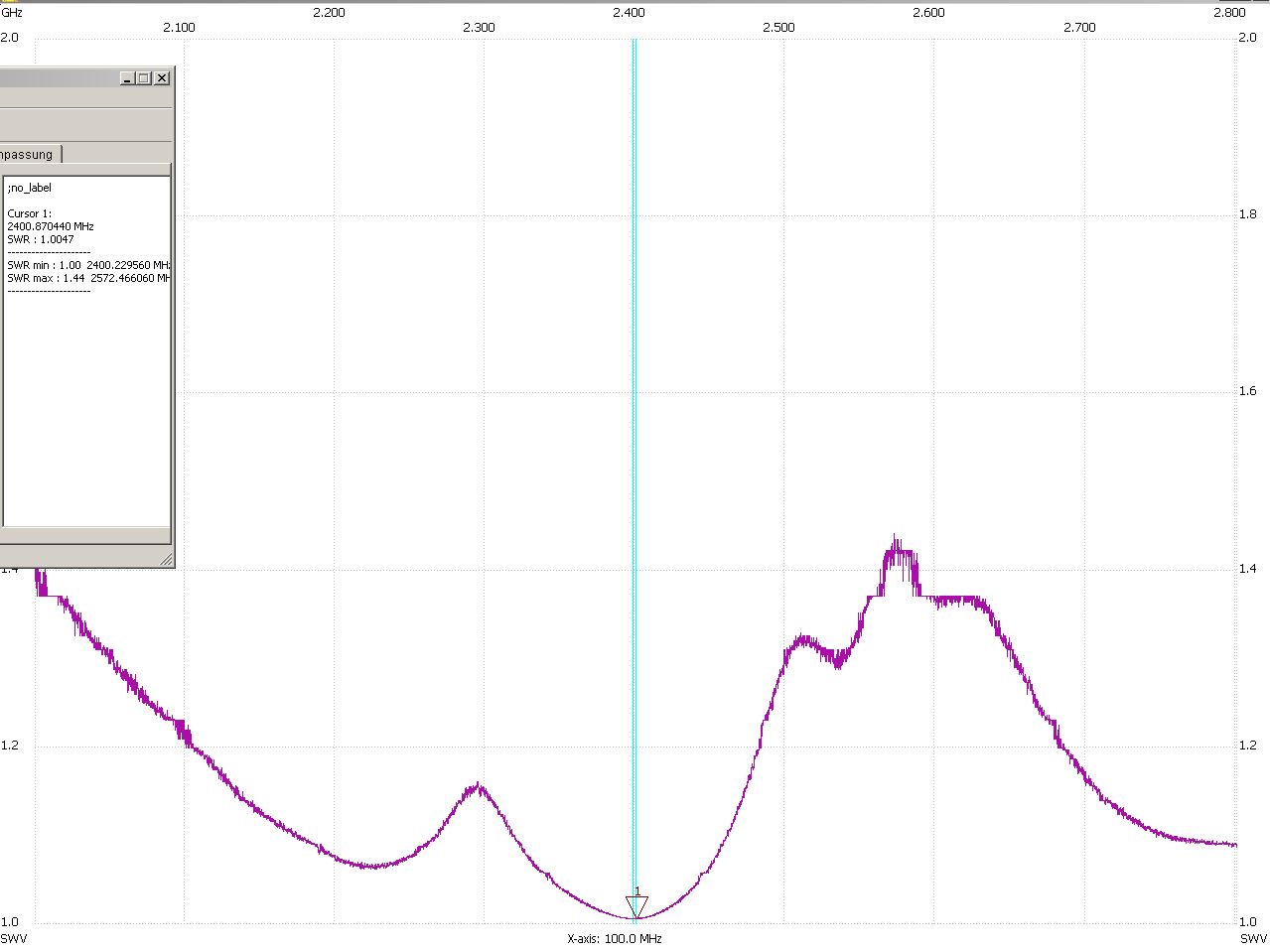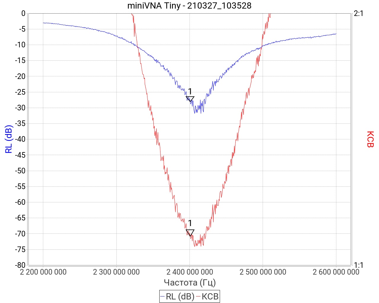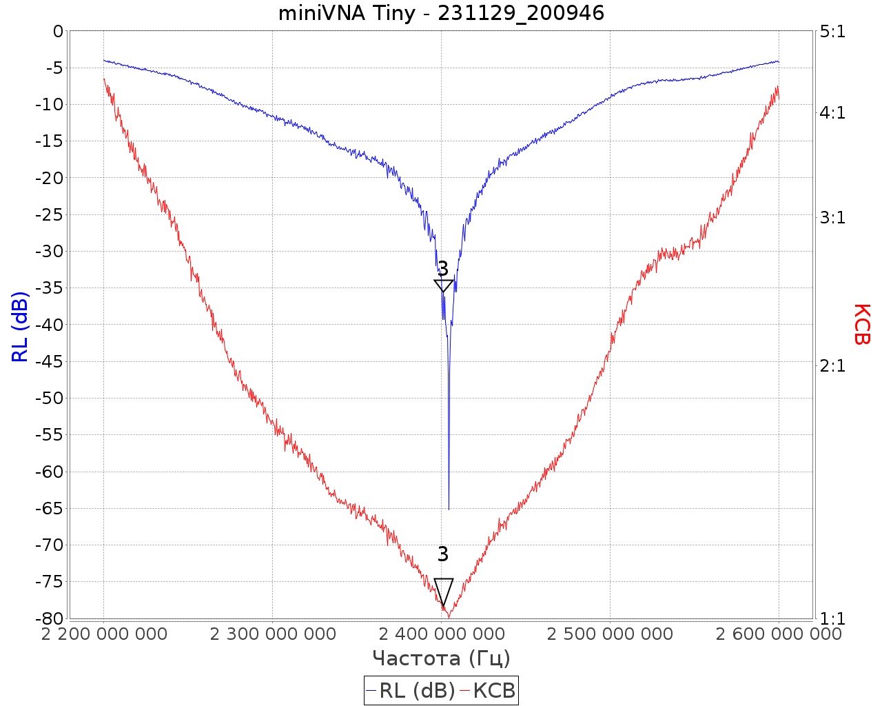 6.С помощью miniVNA измерил КСВ, с хорошим КСВ настроился на 2360МГц.