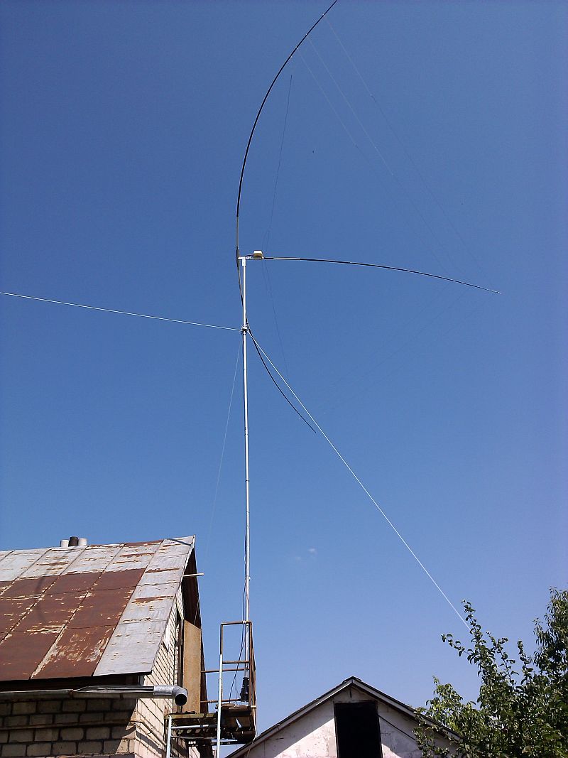 2 элемента на трёх диапазонах (20-17-15 м) Jungle Job, длинный диполь с усилением 9 dBi и несколько dB F/B (на 12-10 м). На диапазоны настраивается конденсатором с севоприводом. Мачта крутится повороткой G-1000DXA. Антенна в 12 метрах над землёй (крыша железная, хуже не делает).