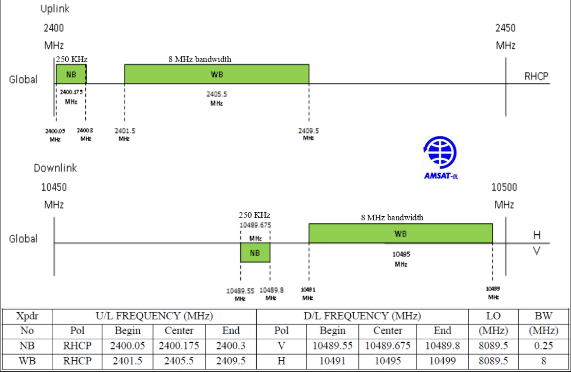 На картинке частот - устаревшие данные, уже полоса расширена и участки перетасованы.EW2CC писал(а):На спутнике Eshail-2 (Oscar-100) рекомендована к использованию российская частота приема 10489.670 МГц для USB по договоренности многих операторов России.