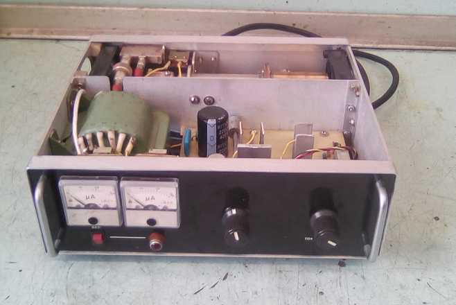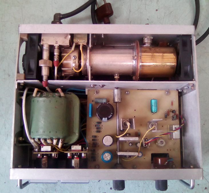 Питание усилителя:анодное напр. 380 в, ток измеряется косвенно,по падению напряжения на подстроечном резисторе в цепи катода.В общем макс.мощность когда он закорочен, и ток анода достигает 80 ма.В таком режиме лампа начинает реально перегреваться,поэтому применены два вентилятора в катодной части лампы втяжной ,в анодной-вытяжной, и на печатной плате собраны всего лишь их ист.питания, ну и анодный выпрямитель.Радиатор на конце анодного резонатора тоже был установлен позже,как доработка.Получилось немного- "баня,через дорогу раздевалка". При напряжении на катоде 2в,следовательно на сетке -2в и подаче сигнала анодный ток возрастает на 20 ма.