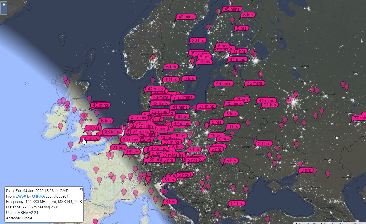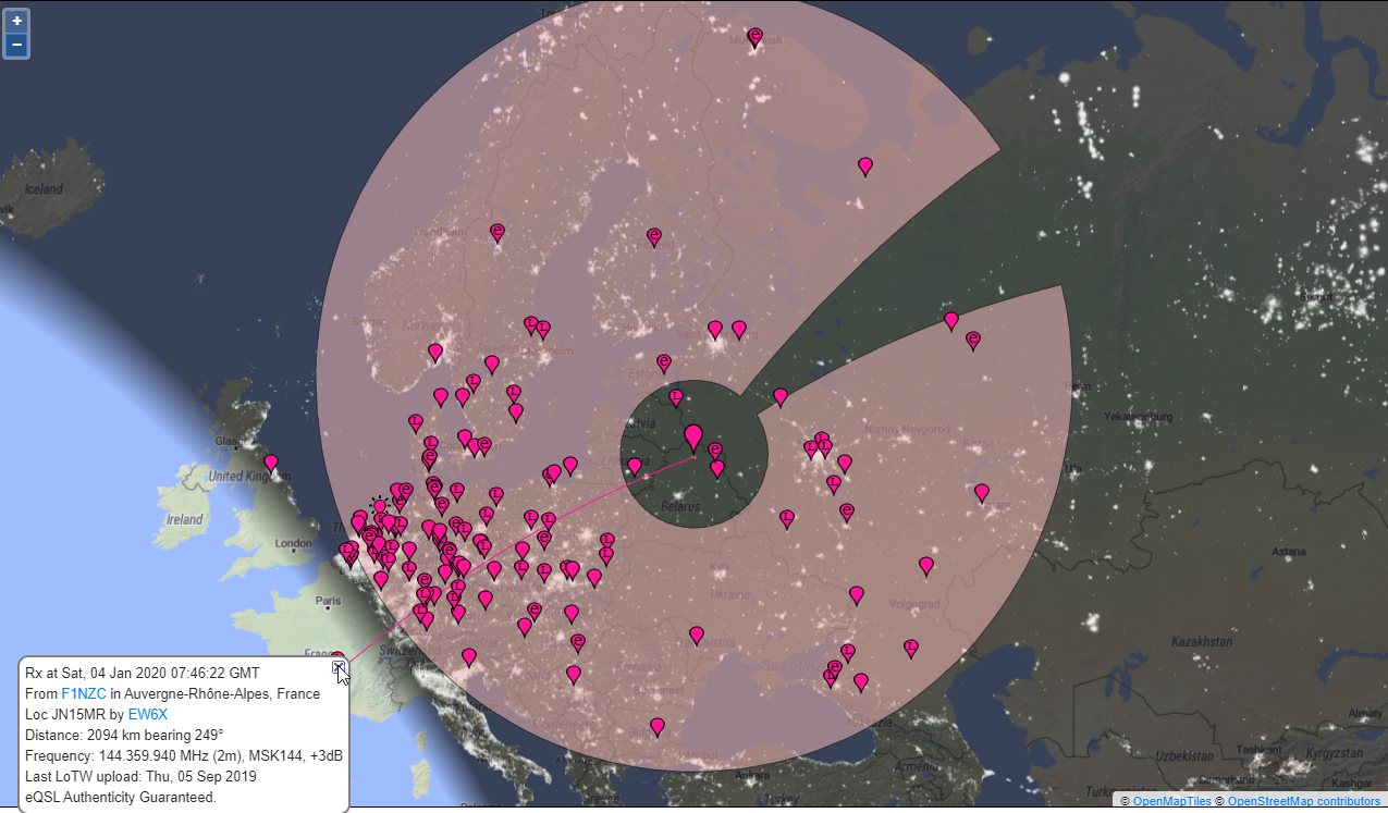 Мой CQ был декодирован как минимум 6ю британскими станциями (pskreport), лучший +16. Все декоды по югу, + пара декодов по северу Польши. По азимуту цеплял Данию, север Германии, Голландию - никого.
