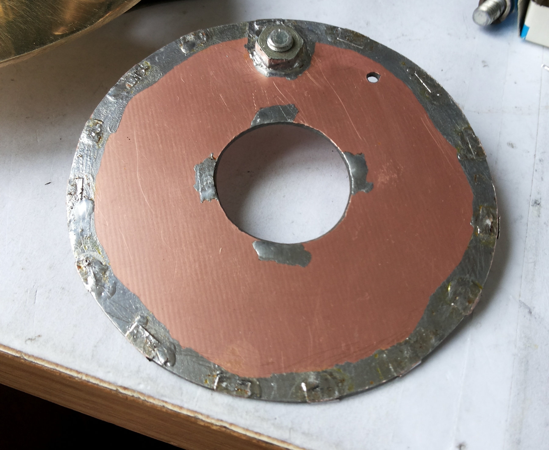 5 Отступаем от края трубки 10мм, надеваем и паяем диск рефлектора Ø100мм, благо имеется доступ паяльником с двух сторон.