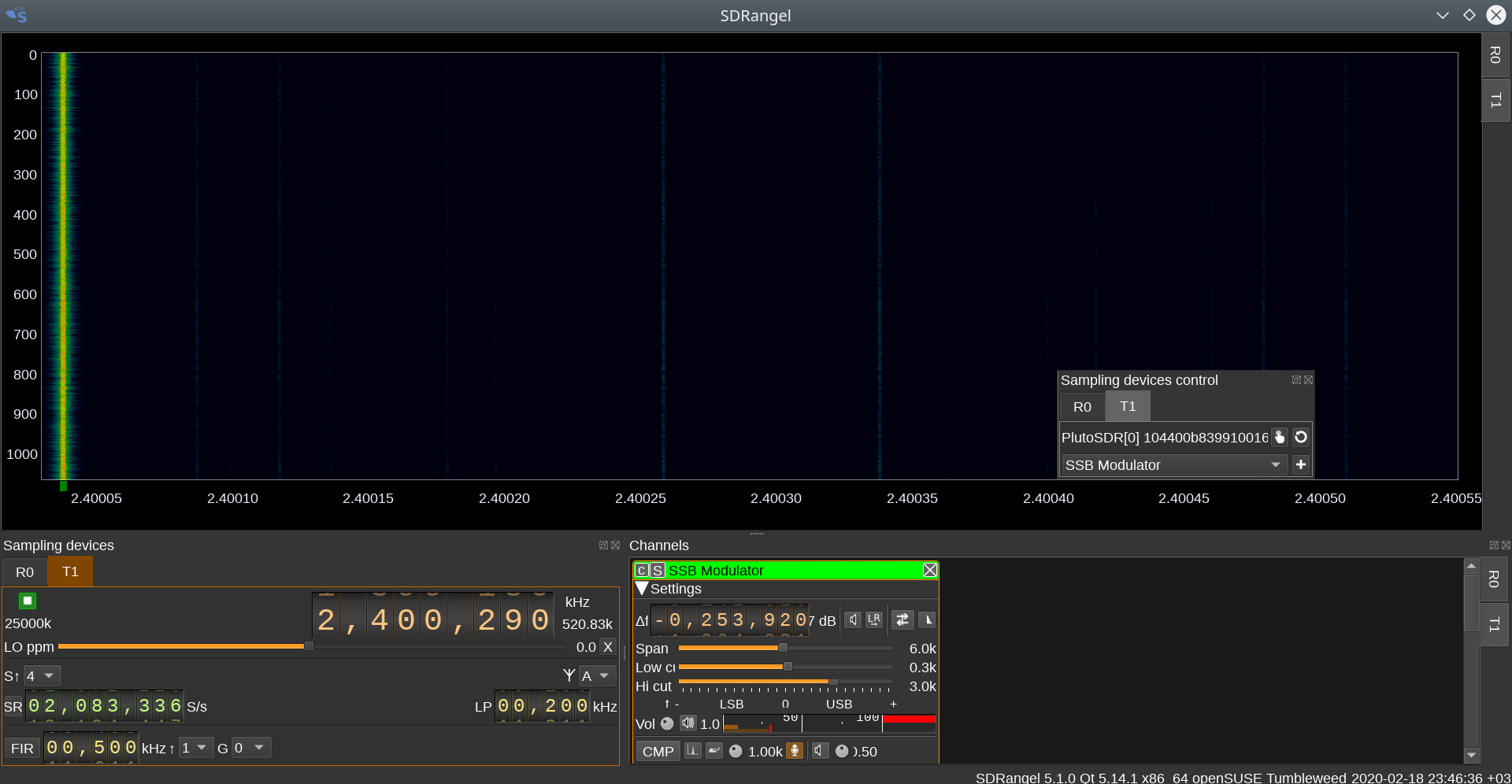 - окно T1 передатчика PLUTO согласно конфигурационному файлу qo100.json5 устанавливается на центральную частоту 2400,193МГц;