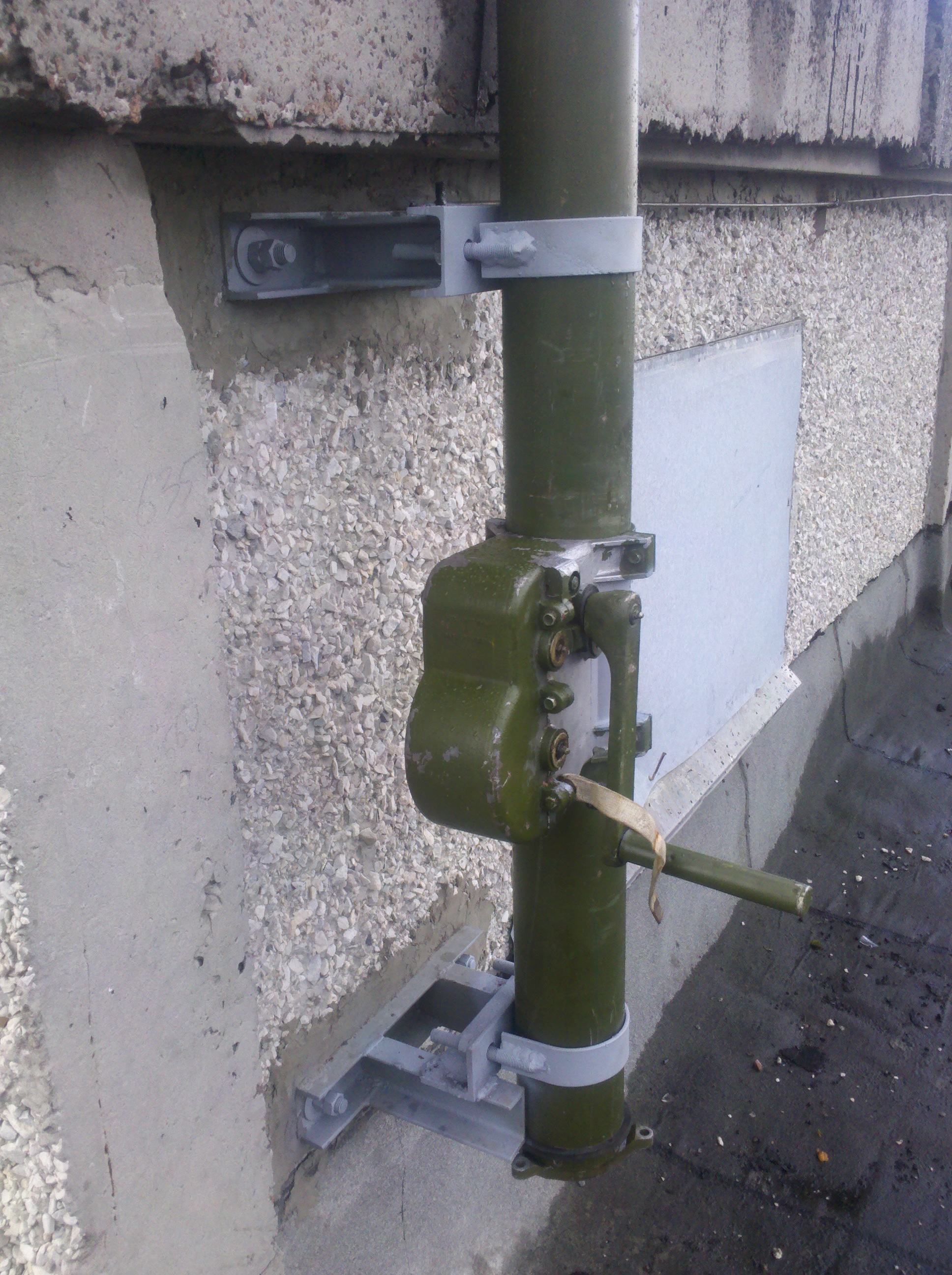Выкладываю фото варианта установки мачты телескопа на парапет надстройки лифтовой. Может кому пригодится в качестве идеи. Обычно у коммунальщиков головная боль - целостность кровли, отсюда и препятствие и нежелание решать вопросы установки радиолюбительских мачт на крышах. В данном варианте нет угрозы повреждения кровли.