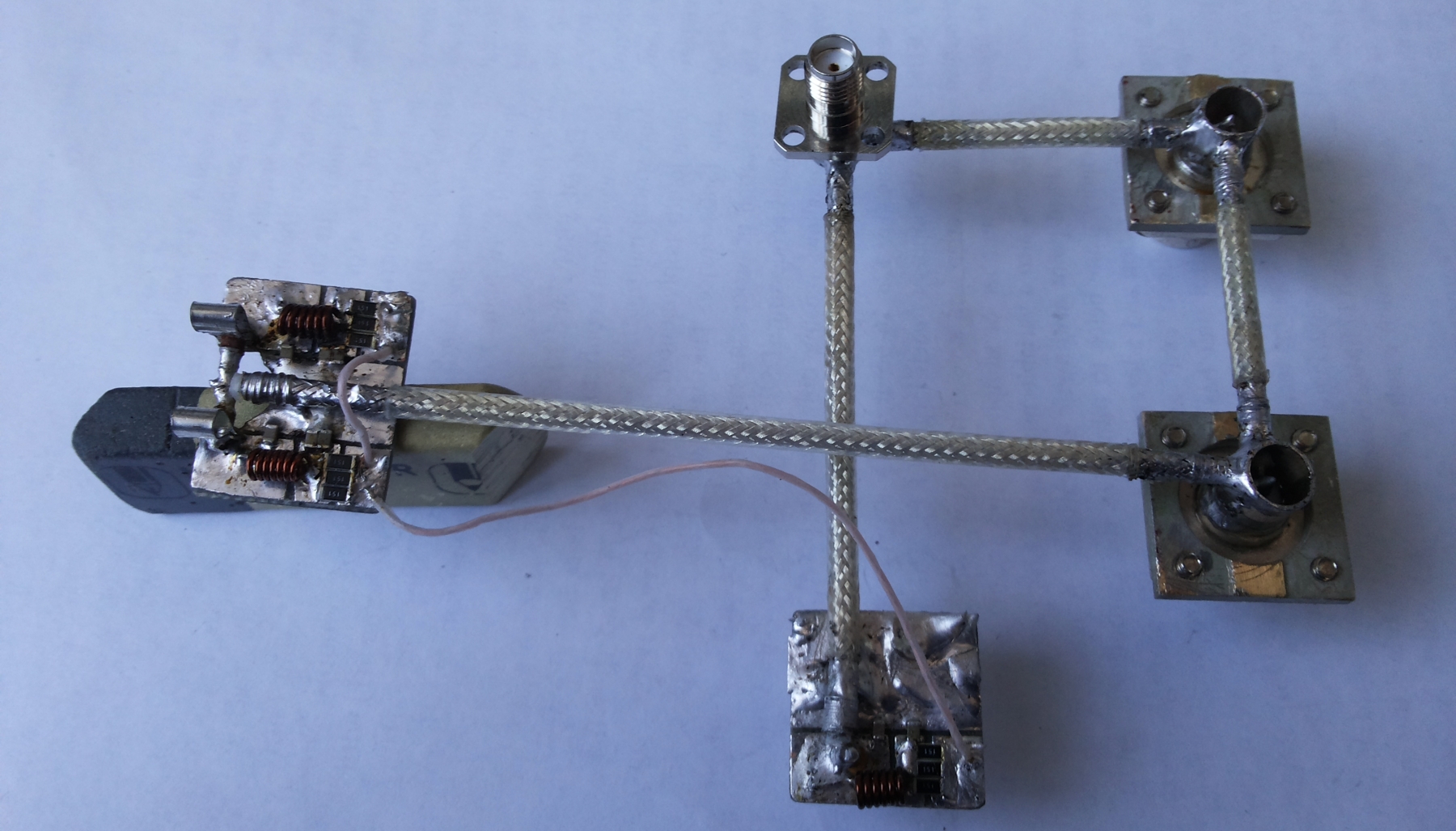 Орудуя пинцетом и паяльником, вытесняя припой из под места подпайки оплетки кабеля поочередно с двух концов, нужно точно настроить значение пролаза мощности передатчика в тракт приема TX-RX, минус 32 dB на частоту 1296МГц.