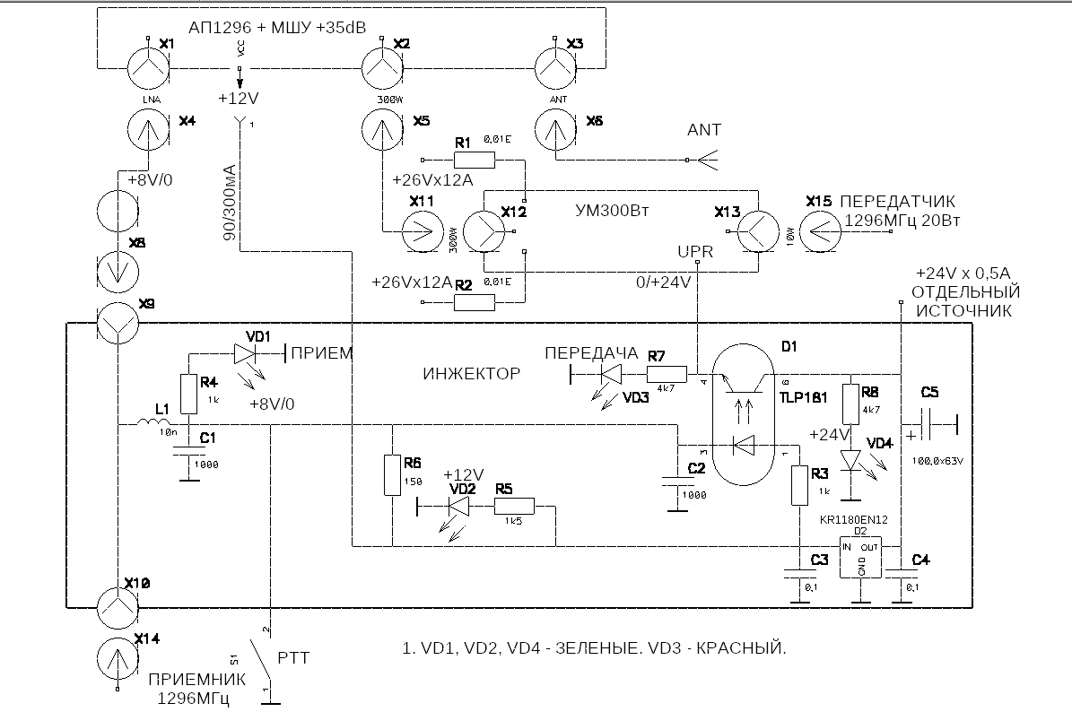 Ток потребления по цепи +12В - 90мА на ПРИЕМ, 300мА на ПЕРЕДАЧУ.