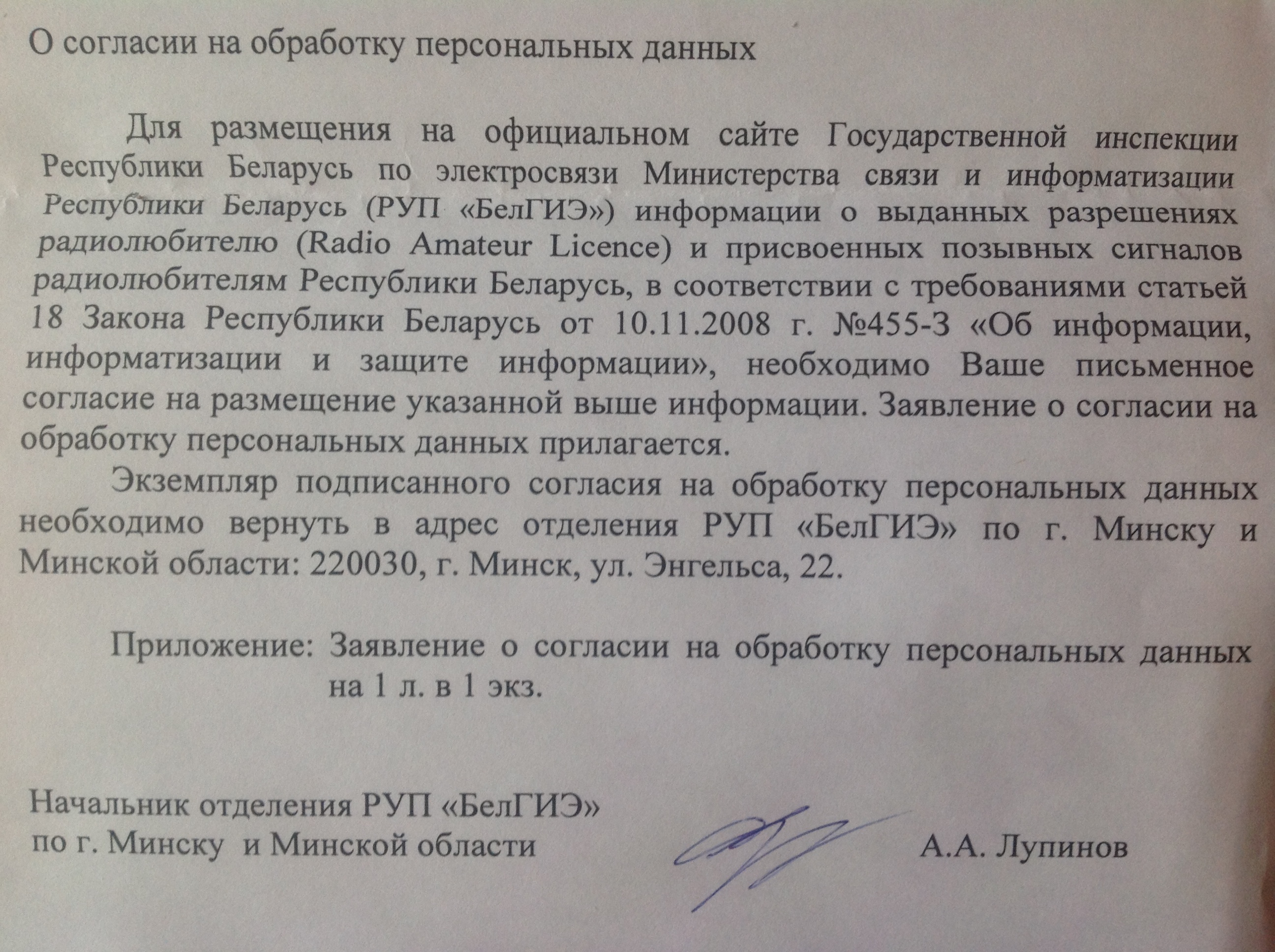 Про QSL полный бред, каким боком здесь ГИЭ. Они просто создают базу в которой будут фигурировать лицензии, разрешения, регистрация РЭС, оплата спектра. Никто базу в интернет вываливать не собирается. База с данными будет доступна только службам имеющим права проверки перечисленных данных. Ведение такой базы избавит радиолюбителей от необходимости иметь при себе документы выдаваемые ГИЭ. Если не нравится не давайте согласия, но тогда бумажки держите при себе.eu4wnc писал(а):...Лічу для QSL у інтэрнэце і так інфармацыі дастаткова, хто захоча, той знойдзе. А ўвогуле, пра сябе ў інтэрнэце можна знайсці такога, што і сам пра сябе ня ведаеш, толькі трэба ведаць, як шукаць.