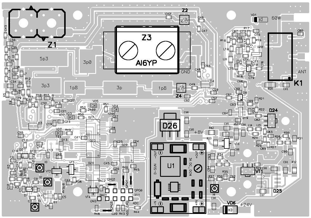 60Вт ШПУ, реле HF351 и антенный разъем Х6 завершают тракт передачи.
