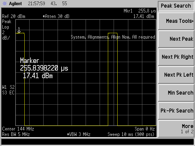 Установите максимально широкую полосу пропускания, (ResBW=5МГц, VideoBW=3МГц), чтобы не пропустить какие-либо выбросы или помехи, которые могут возникнуть при установлении импульса.