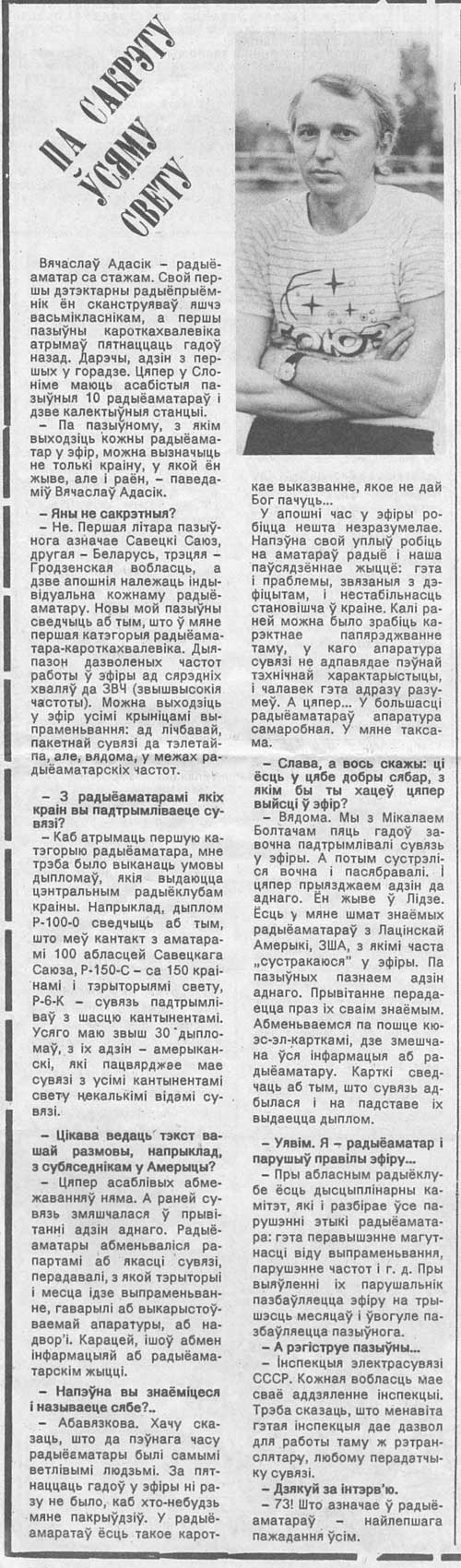 Много лет прошло с тех пор, когда школьниками мы бежали на перегонки на коллективку (UC1IWL), что бы успеть поработать в эфире. Мало- помалу опыт работы в эфире набирали, стали японцы проскакивать, америкосы, Европа. В то время около Слонима в Жировичском техникуме учился Сергей Хмарик (EW1SM), он то нас и научил телеграфом работать. Участвовали мы и в чемпионатах БССР по радиосвязи, ещё на 80 и 160 проходили соревнования. Повторы вели на большом ватмане по последней букве . В летние месяцы коллективка разворачивалась в пионерском лагере с /А