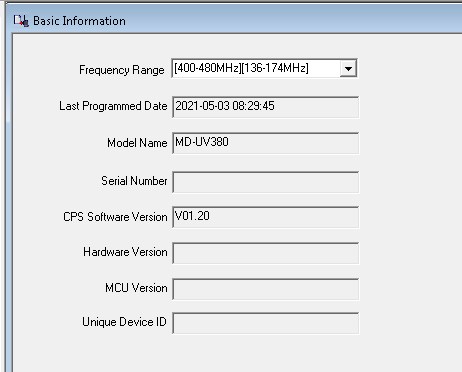 И да, Александр абсолютно прав, кетайские кабели - это всегда лотерея. Могут нормально работать "из коробки", а могут вести себя непредсказуемо. Для однократного программирования лучше найти у кого - нибудь из владельцев 380/390-й проверенный. Первым показателем работоспособности шнурка-драйвера-программы будет надежное считывание исходного codeplug`а программой. Должен быть виден процес считывания, а по завершении - заполнены поля раздела Basic Information (в т.ч. Serial Number, Hardware Version, MCU Version, Unique Device ID):