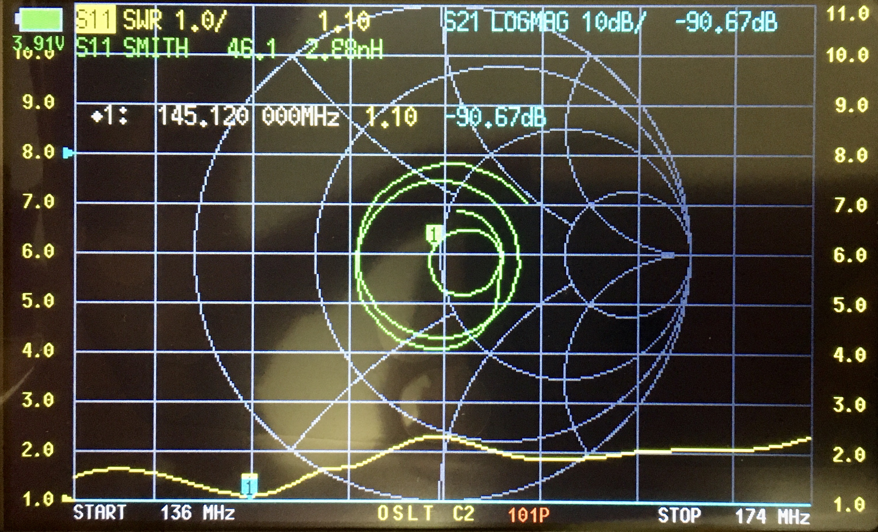 Ну вот, путем некоторых подстроек излучателя и противовесов получилось так. Но это не идеальные условия испытания.