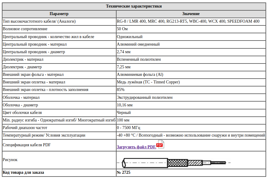 Кабель Ericsson TZC-500 новый. Центральная жила — омедненный алюминий, диэлектрик — вспененный полиэтилен, Диаметр кабеля — 10мм. Разъемы подходят те же что и на кабель RG-213. Хорошо работает в УКВ диапазонах. Остальные параметры в прикрепленных файлах. Цена 2 рубля 50 копеек за погонный метр. Доставка через транспортную компанию. Оплата доставки на стороне покупателя.