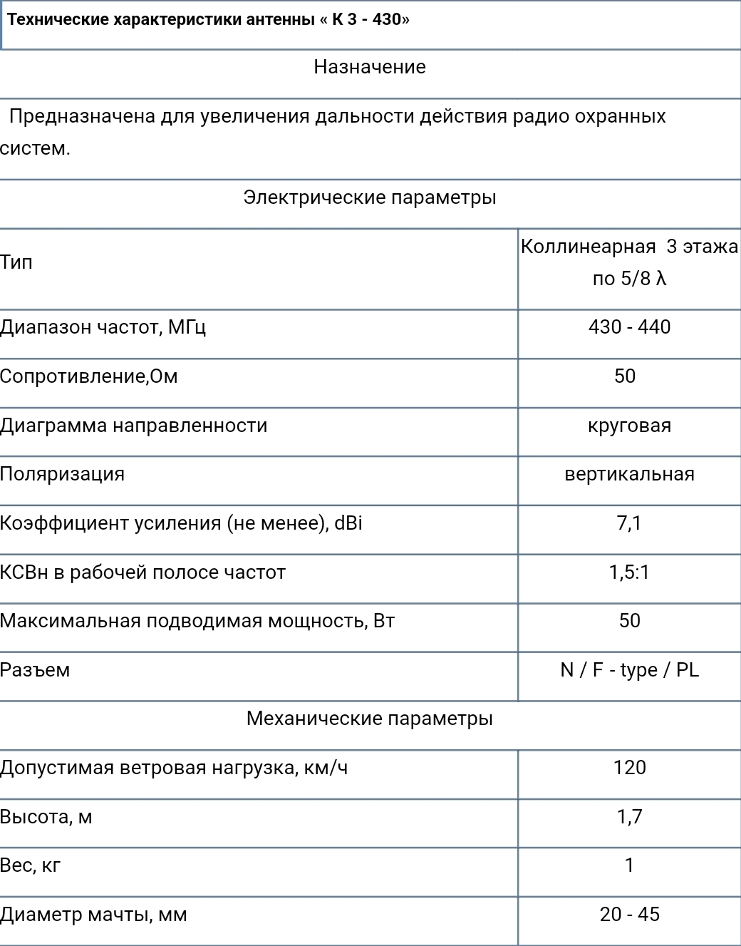 Коллинеарная UHF антенна «К3-430» применяется, как базовая и для ретрансляторов среднего радиуса действия. Установка антенны производится на мачту, или кронштейн вне помещения. Эта антенна разработана и оптимизирована специально для этих систем, поэтому заметно эффективней антенн аналогичного размера других производителей. По параметрам её можно сравнить с известной антенной «ANLI — 200MU».