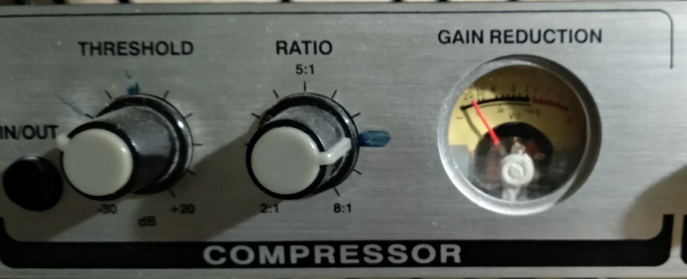 Секция оптического компрессора содержит регуляторы порога срабатывания, степени компрессии, стрелочный индикатор ослабления уровня усиления (Gain reduction), переключатель "ОБХОД" - Bypass, с помощью которого сигнал можно направить на выход, минуя компрессор.