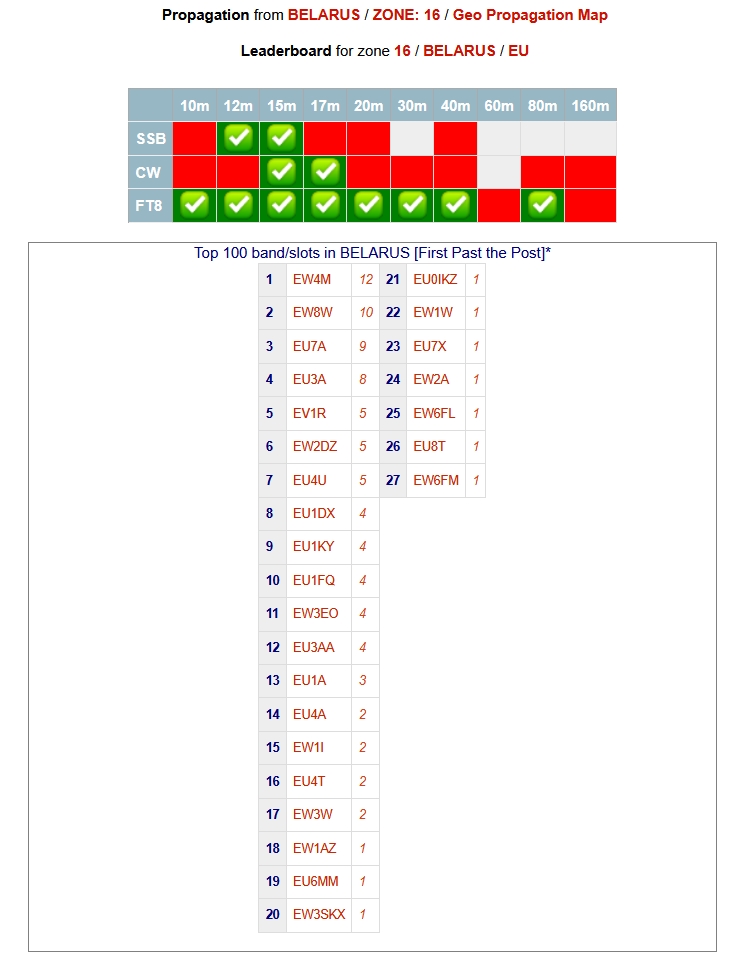 Для самого оптимистичного случая при наличии очень хороших антенн и энергетики с двух сторон, при работе в FT8 дана таблица. При работе CW и SSB условия будут сложнее.