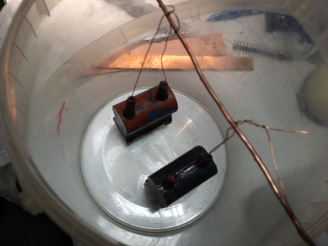 Выбрана подабающая посудина и две заготовки подвешены для заливки формовочным силиконом