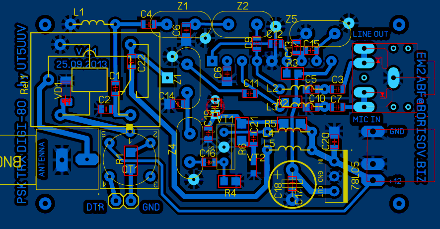 День добрый, опыта нет, но давайте соберем ради интереса. Правда кварцев не большой выбор, в продаже нашел именно то, что на схеме. Вот набросал плату, правда реле не разводил, пока не знаю какое попадется под руки.RA4FOC писал(а):Коллеги у кого нибудь есть опыт постройки QRP трансивера для работы в JT65?