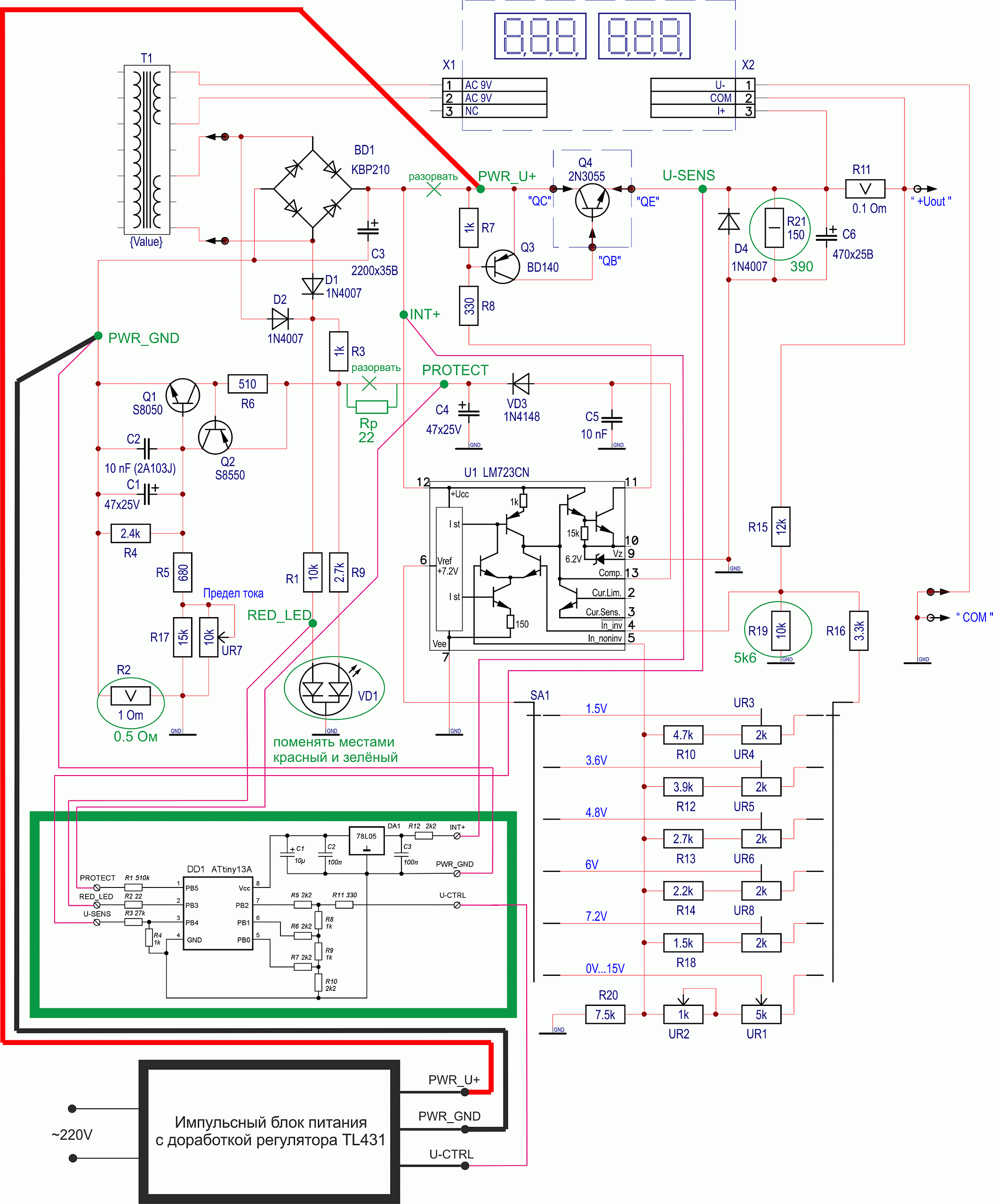 Следить за напряжением было поручено микроконтроллеру tiny13(1$), а в качестве регулируемого источника был взят китайский импульсный источник питания 12В/4А; к управляющему выводу TL431 был допаян провод для регулировки напряжения и изъят резистор, задававший выходное напряжение 12В (резистор между землёй и управляющим выводом TL431). Упрощённо говоря, получился импульсный источник, напряжение которого можно регулировать, замыкая управляющий вывод TL431 через резистор на землю: чем меньше резистор, тем выше напряжение на выходе источника. А для чего в таком случае требуется доработка источника PS-1502DD, почему бы сразу не запитаться от импульсного источника?