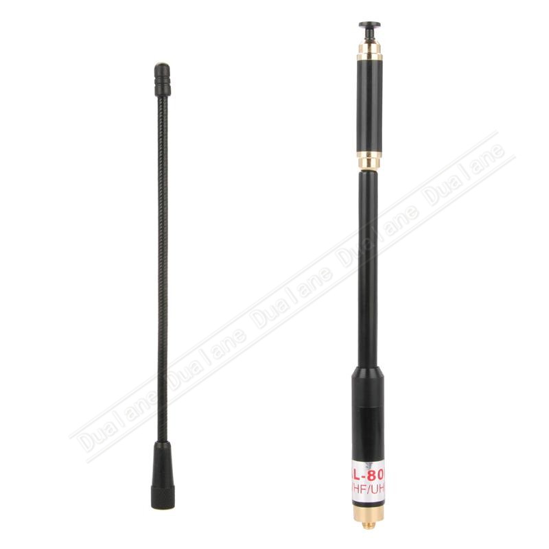 В комплекте 2 меняющихся антенны: телескоп с катушкой посередине общей длиной с основанием 856 мм и обычная резинка общей длиной с основанием 225 мм. Телескоп вероятно предполагается для полевых условий, а резинка для не полевых взаимозаменяются на основании длиной 70 мм с резьбовым соединением (не очень надёжном). Тесты показали не плохую работу телескопа на 2-ке в полностью разложенном виде, что не удивительно для такой длины. На 70 см телескоп показал лучшие результаты при полностью выдвинутых верхних секциях от катушки и двух самых нижних от катушки (длиной 685 мм). Резинка как-то работает на 70 см и совсем не работает на 2 м. Можно рекомендовать для полевых условий при работе с крупными радиостанциями типа Yaesu FT-60 или подобными, т.к. телескоп довольно массивный.