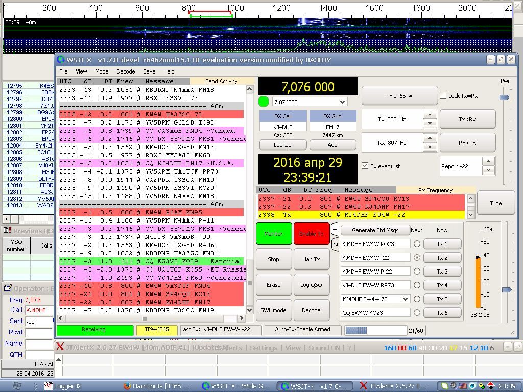 Вот эту ссылку я держу открытой: http://hamspots.net/jt65/ и вот эту: https://pskreporter.info/pskmap.html?EW4W.