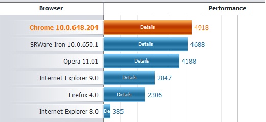 Chrome показывает наилучшие результаты. :) Кому интересно, даю ссылку на сайт, с помощью которого это анализировалось: http://clients.futuremark.com/peacekeeper/index.action
