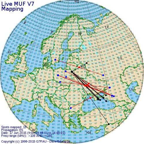 Первый спорадик в 2015 через который удалось провести QSO. В общей сложности длился около 40 минут. Сработал на 144МГц только UC6A kn84pv 1384км. Слышал громко его работу на общий вызов около 15 минут. Больше никого. Все остальные были на работе :-(