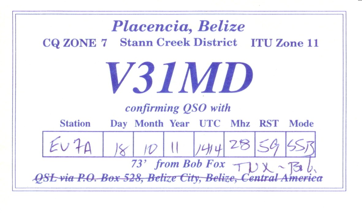 Вот такую карточку получил сегодня. Сама карточка ничего примечательного не представляет, но вот история проведения связи и получения карточки... Сработал с ним на 12м (уже подтвержден диапазон), слышно было слабенько и поэтому вопросов никаких не задавал. Нашел его e-mail и послал сообщение с просьбой о скеде на 10м (new one). Он оперативно отвечает и соглашается на завтра на 1430 ютс. На завтра начинаю работать на общий вызов с 1400 и хорошо зовут американцы. Тут же шлю ему е-mail и прошу подойти на частоту. Быстро приходит ответ с информацией, что диапазон мертвый и давай, мол позже. Отвечаю - да не мертвый, хорошо идет Северная Америка. Через 3 минуты с оглушительным сигналом меня зовут "NM2D, oh, sorry V31MD". (NM2D его домашний позывной :D ). Проводим связь без проблем. Отсылаю карточку ему direct с приложением IRC, но выписываю только за связь за 10м - не карточки жалко, а просто так иногда бывает, когда выписываешь за несколько диапазонов, то ошибаются и один пропускают. Приходит от него ответ в моем конверте с двумя карточками за оба диапазона и возвращает мой IRC. В другом, его конверте, приходит его карточка с SASE и просьбой подтвердить связь за 12м.