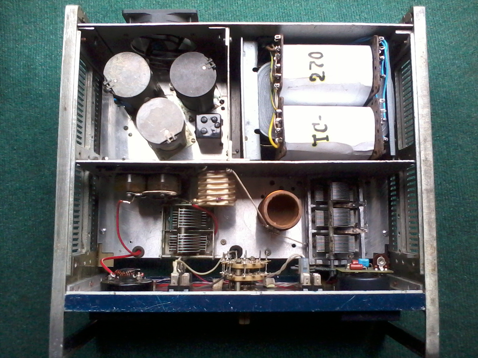 на мой взгляд схема усложнена чрезмерно, анодный источник питания не достаточно мощный, лишние элементы коммутации , нет ВЧ общей шины, материал и компоновка анодного дросселя , компоновка ВЧ части не достаточно проработаны.