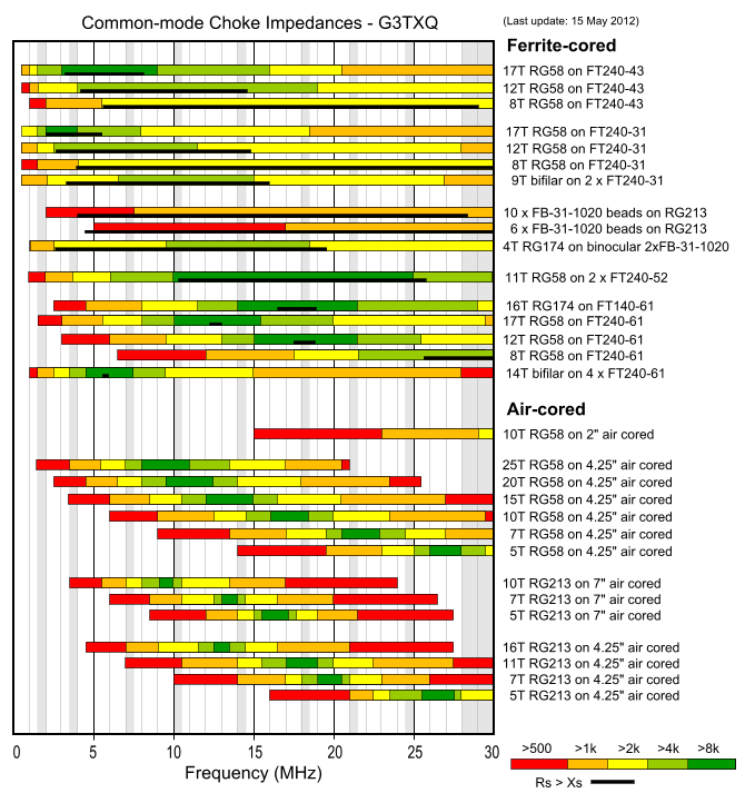 На этой картинке самым удачным запорным дросселем выглядит 11 витков на двух сложенных сердечниках FT-240-52. В широченном диапазоне у него импеданс >8 килоом, а именно такой импеданс запорного дросселя считается минимально необходимым при разрешенной в США мощности 1.5 киловатта, исходя из необходимости добиться рассеиваемой в феррите (а именно на Rs импеданса дросселя) мощности не более 20 Ватт (где-то в статьях W8JI упоминалось, сходу не найду).