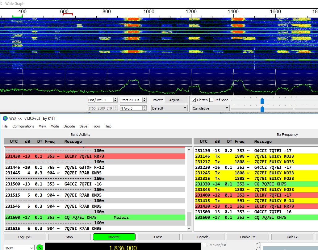 Экспедиция 7Q7EI активно использует FT8 DXpedition mode (fox - hound). Особенно на НЧ диапазонах. Обычно он на 3-4 кГц ниже FT8 участка становится, сам при этом вещает в районе частоты 300 Гц.