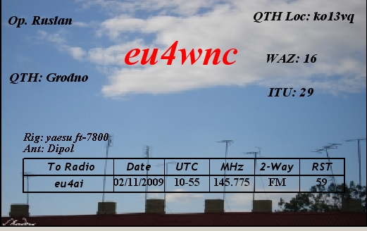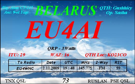 Карточки для белорусов за наши выезды в Беловежскую пущу уже лежат в QSL бюро в Минске. За остальные экспедиции - будут чуть позднее. Еще не печатали, только недавно откатались, :) Как раз решаю эти вопросы.EW1LN писал(а):кстати по карточкам - сижу заполняю, нарвался на 3 QSO с EW5WFF - тоже заполнил