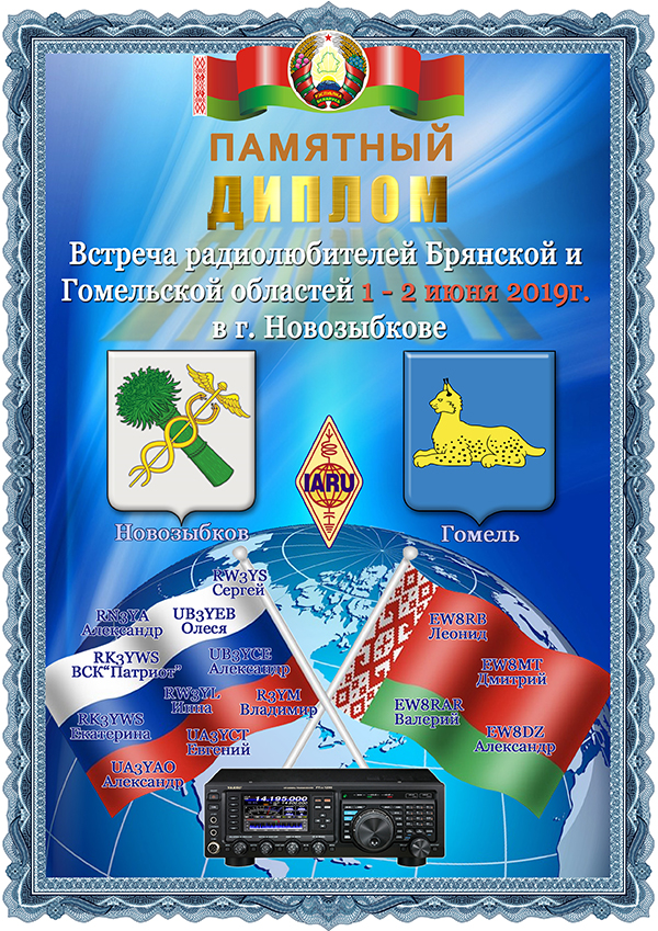 1,2 июня 2019г. Состоится дружественная встреча радиолюбителей Гомельской и Брянской областей в городе Новозыбков. Будут работать радиостанции в диапазоне 80, 40, 2м., радиолюбители RA/EW8RB, RA/EW8MT, RA/EW8RAR, RA/EW8DZ, и радиолюбители Брянской области. Желающие принять участие звонить за ранее по тел: +37529917-93-66. EW8RB.