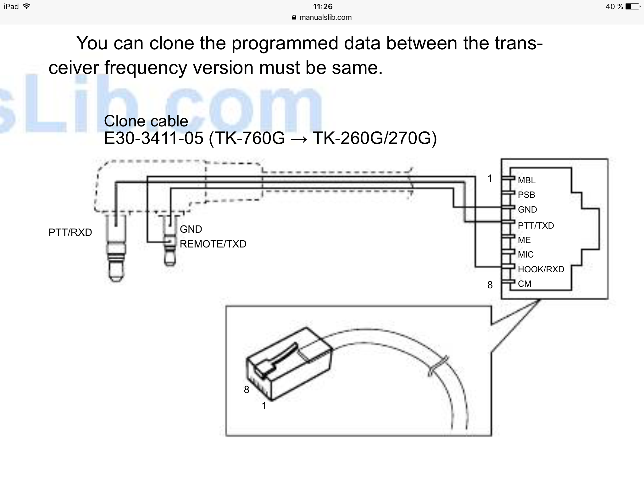 Если функция была запрещена программно, потребуется,таки, применение программатора (KPG67D): http://www.radioscanner.ru/files/downlo ... pg-67d.rar и кабеля: Кабель делается "на коленках" за 10 минут из старого патчкорда и любого преобразователя USB-COM (TTL). Используются сигналы TxD, RxD и GND. Левые разъемы (для клонирования), естессно, не нужны... Отлично подойдут для этих целей универсальные программаторы для китайских хэндиков, Баофенгов и др.